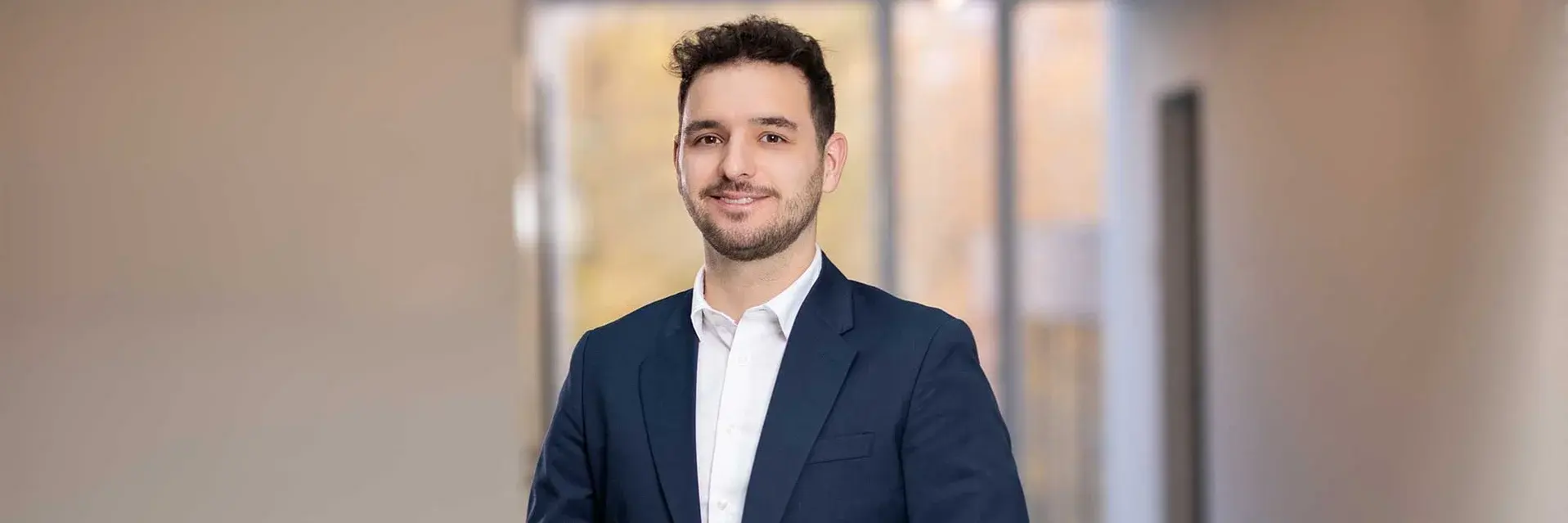 Mann in blauem Anzug, stehend, Arme verschränkt